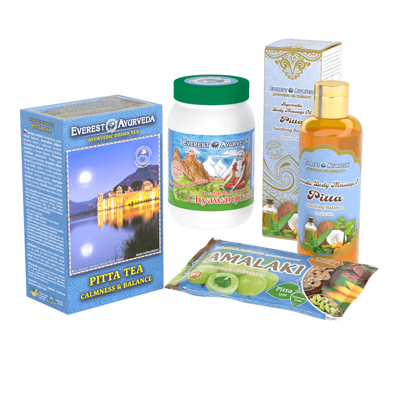 This Ayurvedic doshic therapy is suitable for people with a predominantly pitta constitution. An aggravation of this dosha may cause: acne, hives, rashes, eczema, psoriasis, hemorrhoids, irritability, inflammation, eye defects, insomnia, nausea, stomach acidity, heartburn, ulcers, diarrhea or excessive sweating. Take Pitta Ayurvedic tea along with Chyawanprash nutritive elixir 2-3 times a day and apply Pitta body oil on the skin as part of daily self-massage (abhyanga). Amalaki Pitta nutrition bar contributes to energy metabolism in accordance with the constitutional type of pitta. The therapy is suitable for long term use from 1-6 months.