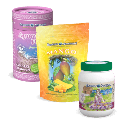 Preparation: wash the recommended fruit, cut it into smaller pieces and put it in a blender. Add 5 oz/150 ml of pure water and one teaspoon of Ayurvedic mixture. Mix for 20-30 seconds. The recipe is intended for one dose 8 oz (250 ml). For a better taste, we recommend always preparing the smoothie from ripe fruit.