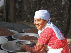 Before any herb is used for further processing, Jawahar Lal and his team first spread it out on the terrace of their herbal production facility so that it can dry thoroughly in the sun and no moisture remains. Nepalese women then clean the herbs by hand and prepare them for use in Ayurvedic mixtures. Their work is extremely careful; they spread each herb on a straw tray and manually remove unwanted parts of the plants. First, one woman cleans the herb, then passes the tray on to a second woman for inspection, and then to a third woman before the herb is ready to be mixed with other herbs. Finely ground impurities are then removed by lightly tossing the entire contents of the tray into the air in the spirit of Ayurvedic wisdom - "what is weightless will fly away, what is valuable will be preserved." Each movement is thus a true ritual.