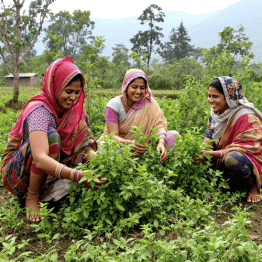 Regular harvesting of field mint is a popular activity among local Nepalese women due to its pleasant aroma, and it has almost become a social event. When women gather to harvest mint, it is not just work—it is a time of lively chatter, laughter, and passing on experiences to younger generations. The scent of freshly picked mint mingles with the sounds of their conversations, creating an atmosphere of peace, love, and relaxation. Field mint, or Mentha arvensis, is found in a wide range of Ayurvedic teas (e.g., Alochaka health tea and Pitta dosha tea) due to its wide range of uses.